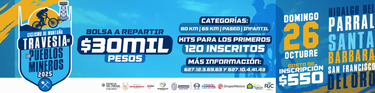 La Presidencia Municipal de Hidalgo del Parral, con la participación especial de los municipios de Santa Bárbara y San Francisco del Oro, a través del Instituto Municipal del Deporte de Parral (INMUDEPA) y con el apoyo del Comité Municipal de Ciclismo de Parral (COMUCIPA), así como de empresas comprometidas con el deporte de nuestra región: CONVOCA a todos los clubes, equipos y ciclistas de montaña del Estado de Chihuahua y estados vecinos, a la “TRAVESÍA DE LOS PUEBLOS MINEROS MTB 2025”